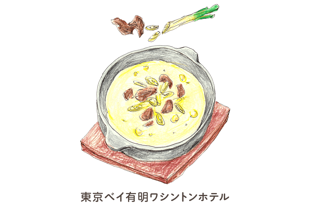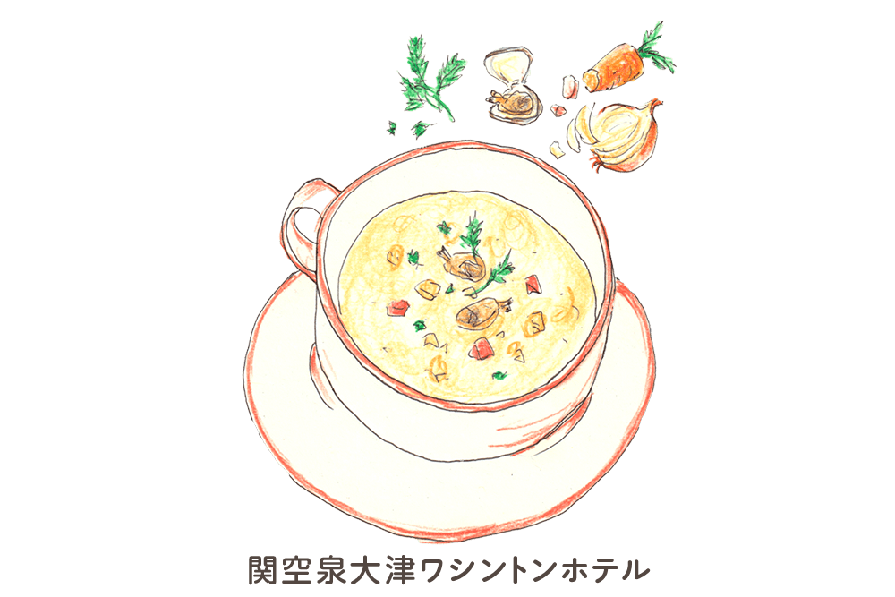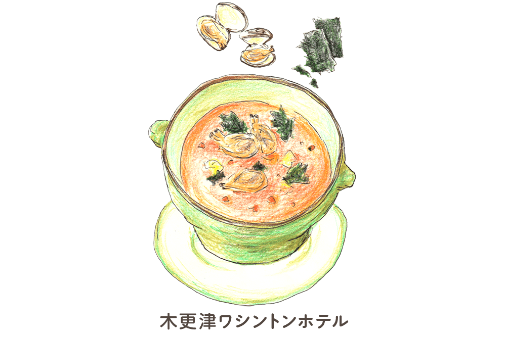 - しんなりするまで炒めて甘みとコクを出した玉ねぎを、ムキアサリと一緒にフィッシュブイヨンスープに加えて片栗粉で濃度をつけることにより、一層の味の深みと磯の香に熱々感を醸し出し、仕上げにとぎ卵と香り醤油を加え、体の芯まで温まる逸品に仕上げました。トッピングには、更に磯の香り漂う炙り海苔を添えた木更津ならではのスープ。
