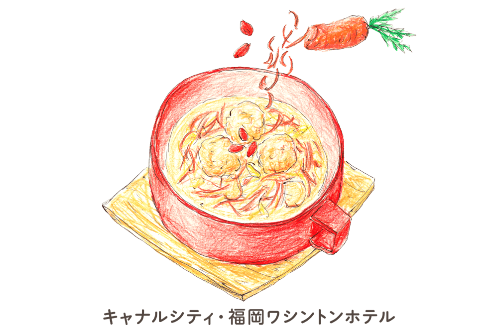 - 九州北部の澄んだ空気の中で、海藻やハーブなどを混ぜた専用飼料で育てられた、博多を代表する銘柄鶏「華味鶏(はなみどり)」のつくねを、鰹節と昆布の出汁にじっくりと漬け込んで旨味とコクを引き出した和風スープに、クコの実と生姜の絞り汁を加え、冷えた体をほっと温める薬膳スープに仕上げました。