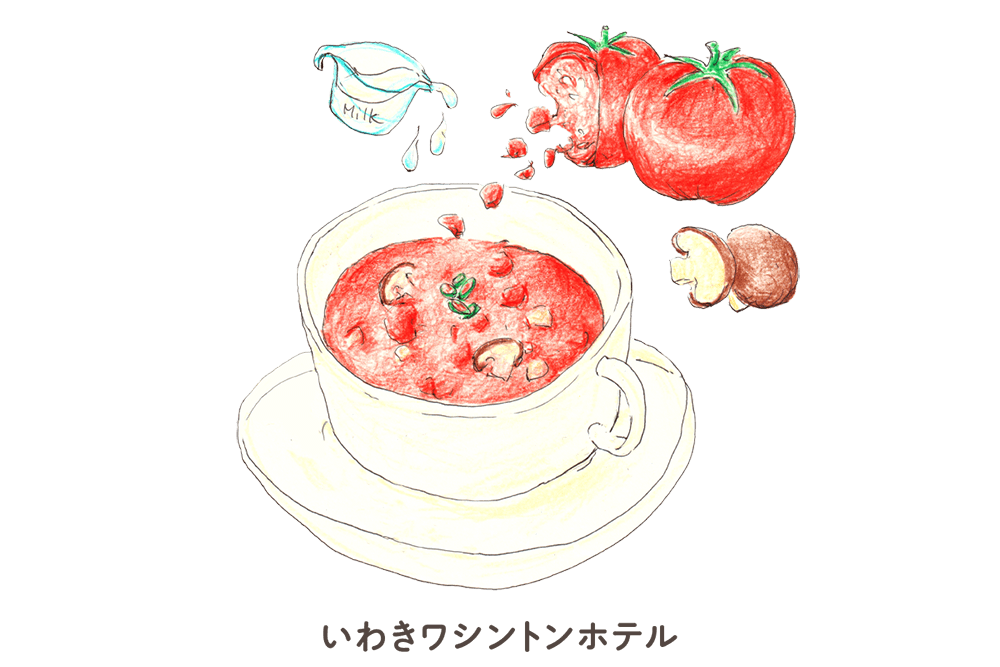 (トマトクリームスープ) - いわき市産の完熟トマト、いわきゴールド椎茸、そして老舗の木村牛乳を使用したトマトクリームスープ。濃厚でまろやかな牛乳が、椎茸の深い旨味とトマトの酸味を引き立てます。じっくりと煮込んだ素材の力で、朝の活力を引き出します。いわきの温かさを詰め込んだ、元気の源となるスープです。
