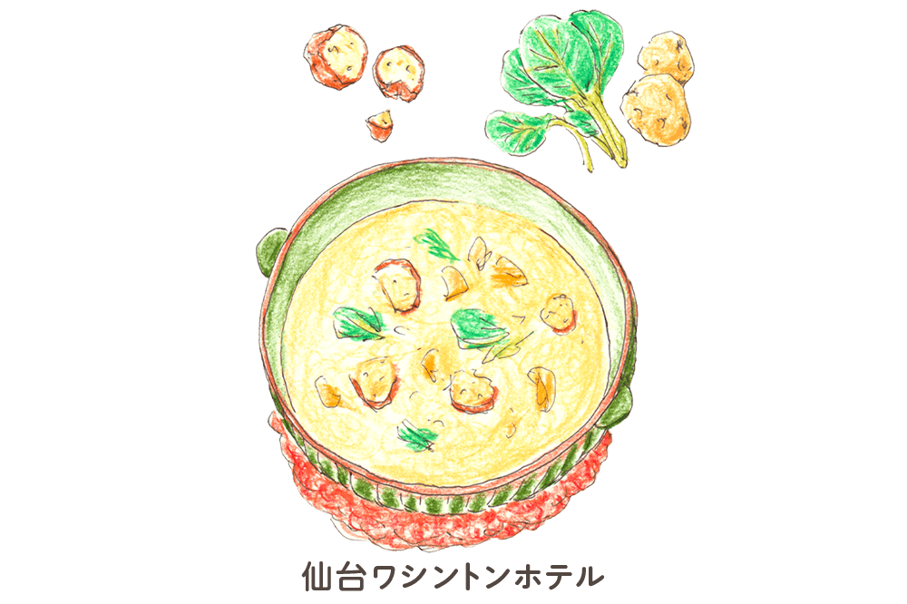 - じゃがいものポタージュをベースに、仙台麩・仙台味噌・仙台雪菜を入れた、仙台食材たっぷりの体も心も温まるスープです。