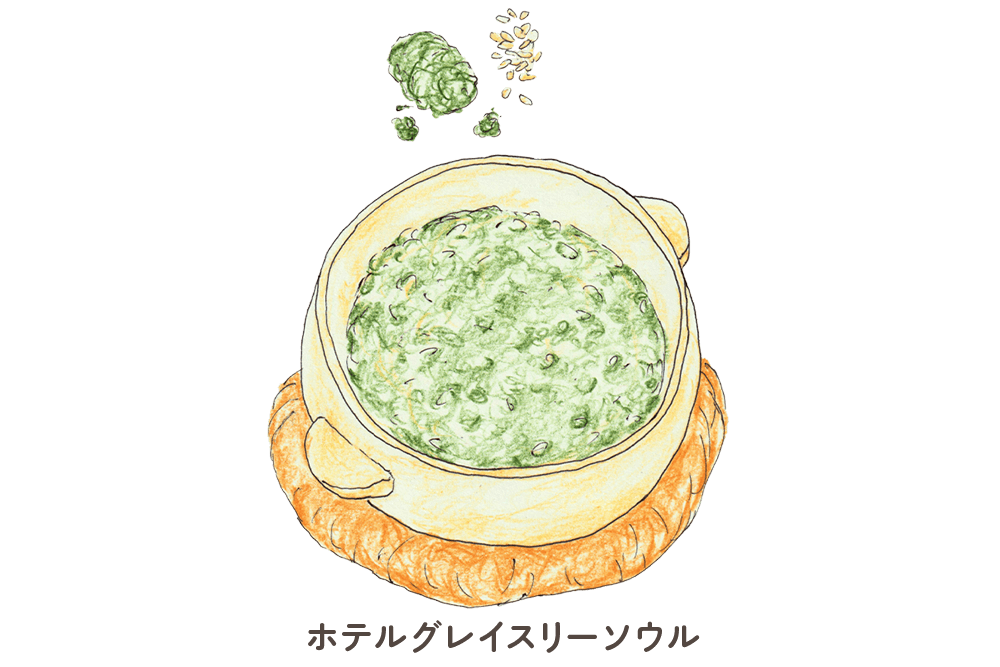 - 韓国の南西部に位置する全羅道(チョルラド)の特産品「マセンイ」を使ったお粥です。マセンイは小さな海藻で、ビタミンC、クロロフィル、カルシウム、鉄分、ミネラルなどが豊富な食材です。