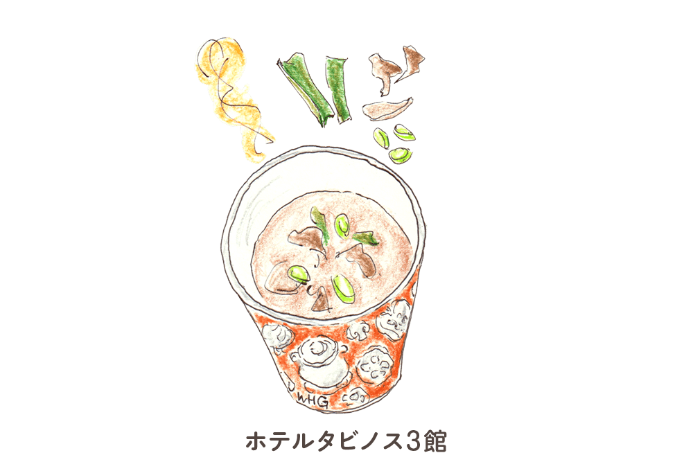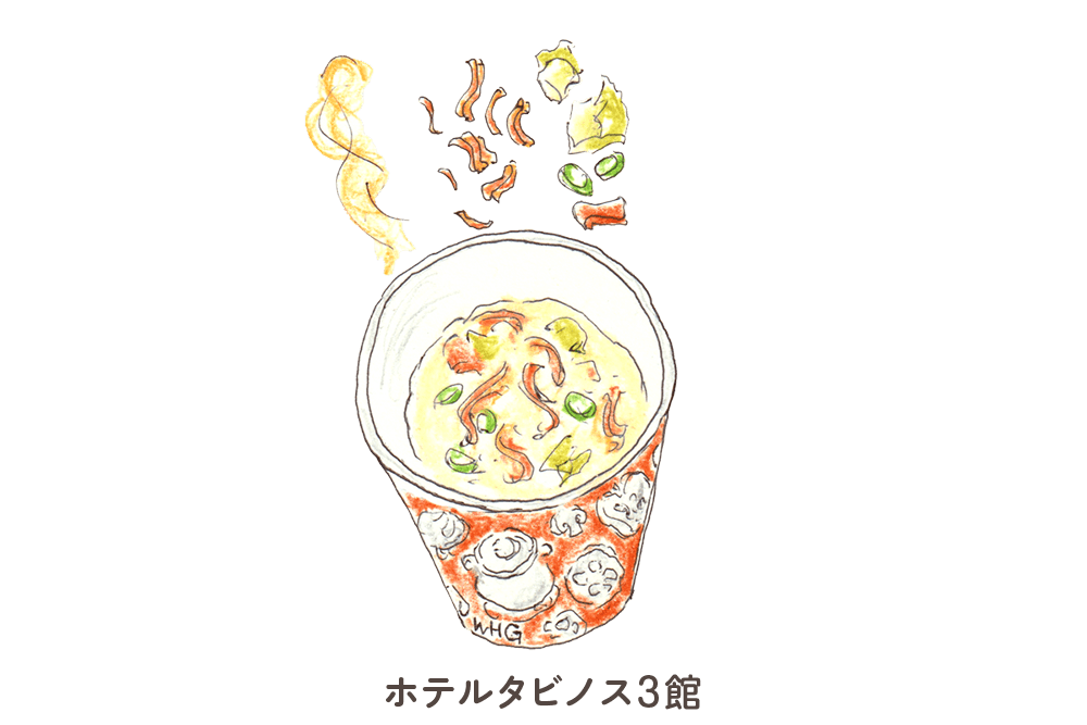 ベビースターとメンマの中華スープ - チキン風味のベビースターの香ばしさが溶け込んだ中華スープです。メンマや白菜、ネギといった具材の風味とうま味がスープ全体を深めます。お湯を注ぐだけで完成する、どこか懐かしい味わい。朝の体に染みわたる一杯です。よくかき混ぜてお召し上がりください。